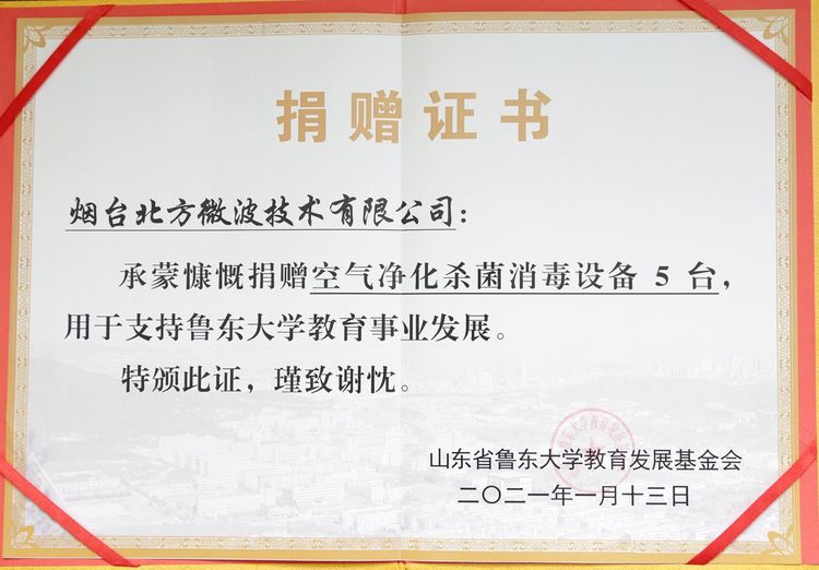 2021年1月13日上午八點三十分,煙臺北方微波技術(shù)有限公司空氣消殺設(shè)備捐贈儀式在魯東大學1號辦公樓會議室舉行,公司董事長王愛華女士攜總工程師李超,研發(fā)中心主任劉愛杰,副技術(shù)部長鄒曉鵬向魯東大學捐贈公司研發(fā)生產(chǎn)的空氣消毒機。魯東大學校友辦于欽凱主任代表學校接受捐贈。